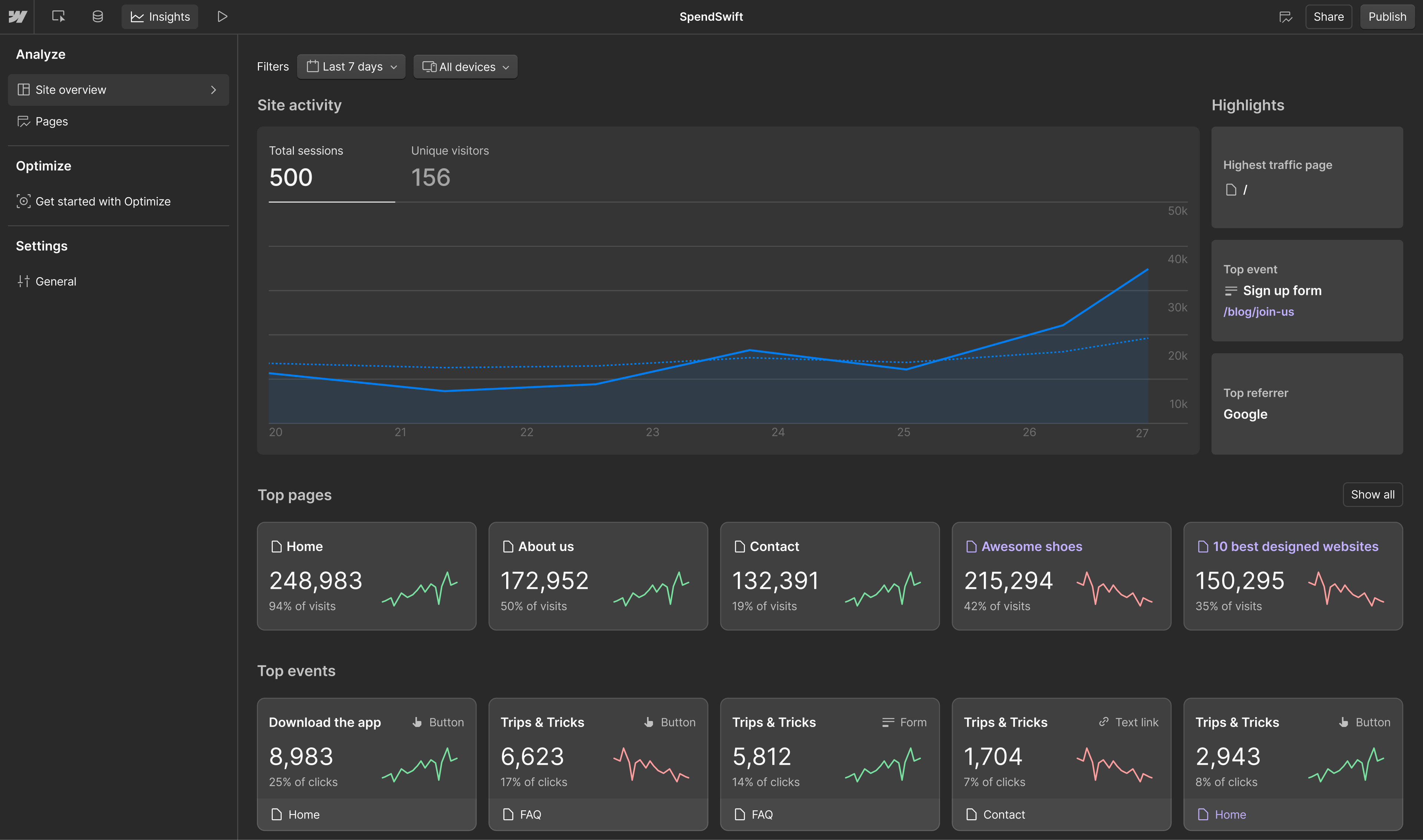 However, Webflow Analyze cannot set and track goals. It also lacks integration with a broader marketing stack. These limitations make it less suitable for growth-focused strategies.